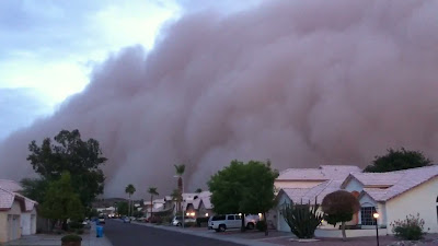 Arizona sandstorm/ haboob 2011 07 05 photo showing downtown Phoenix: the day becomes the night, street lights turning on, whirling sand darkening the sun.