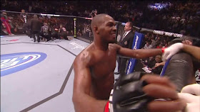 UFC 144 light-heavyweight championship: too-long-limbed Jon Bones Jones defends the title cutting Lyoto Dragon Machida's forehead with an elbow and, then, choking him out via standing guillotine.