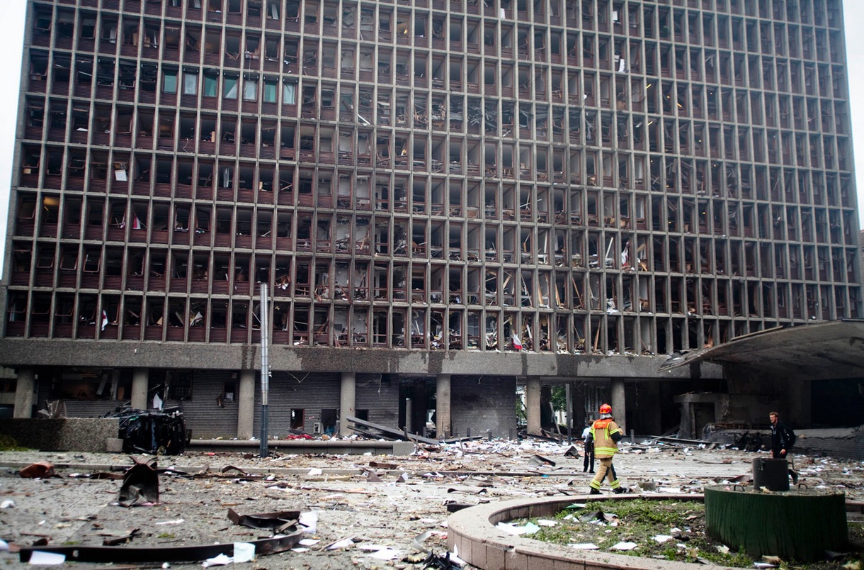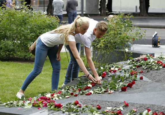 Prime Minister Jens Stoltenberg laid wreaths outside the damaged Norway government's building.